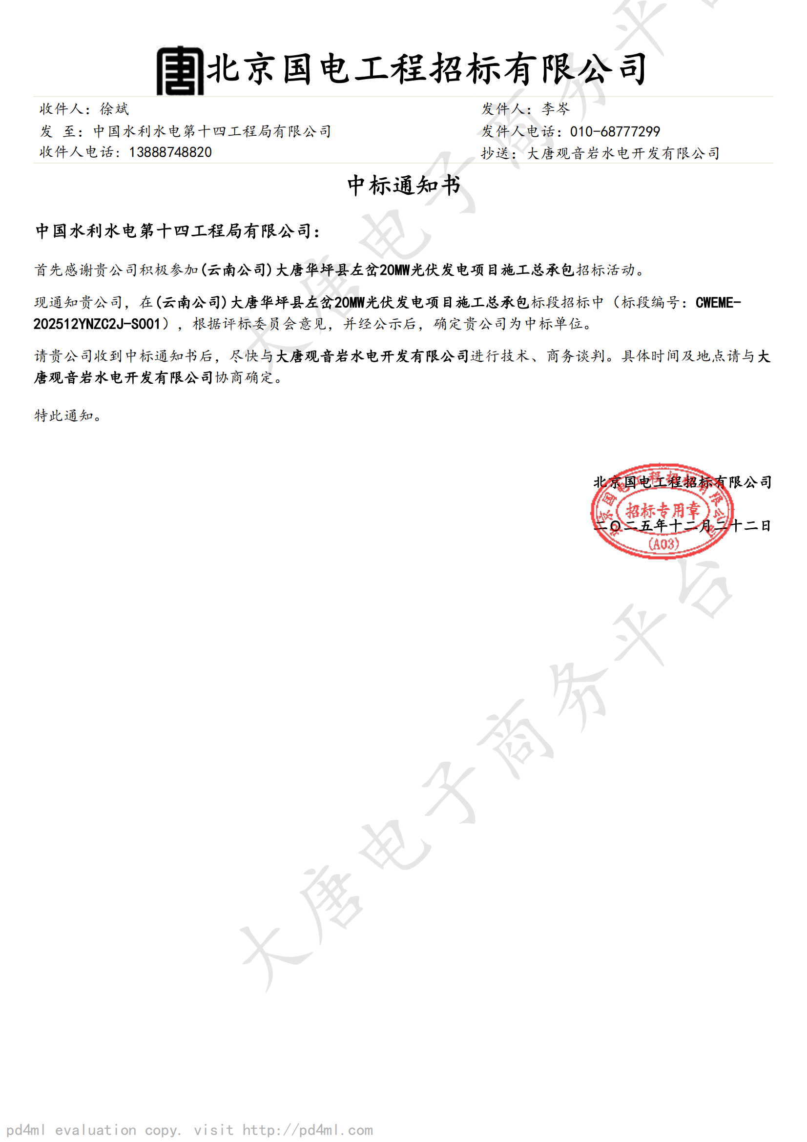 12月22日,公司中标大唐华坪县左岔20MW光伏发电项目施工总承包,中标金额6015.82万元。 本项目位于云南省丽江市华坪县,主要包含220kV升压站、220kV送出线路(接入500kV德茂变)、光伏发电场区(含35kV集电线路、光伏区场内道路、进场道路工程)。包括但不限于施工、采购、调试、服务(含竣工及专项验收工作、各类协调配合前期专题工作等)。 项目建成后将为当地产业转型注入绿色动能,在推动经济发展、促进就业增收的同时,改善生态环境、服务乡村振兴,实现经济效益、社会效益与生态效益的有机统一。