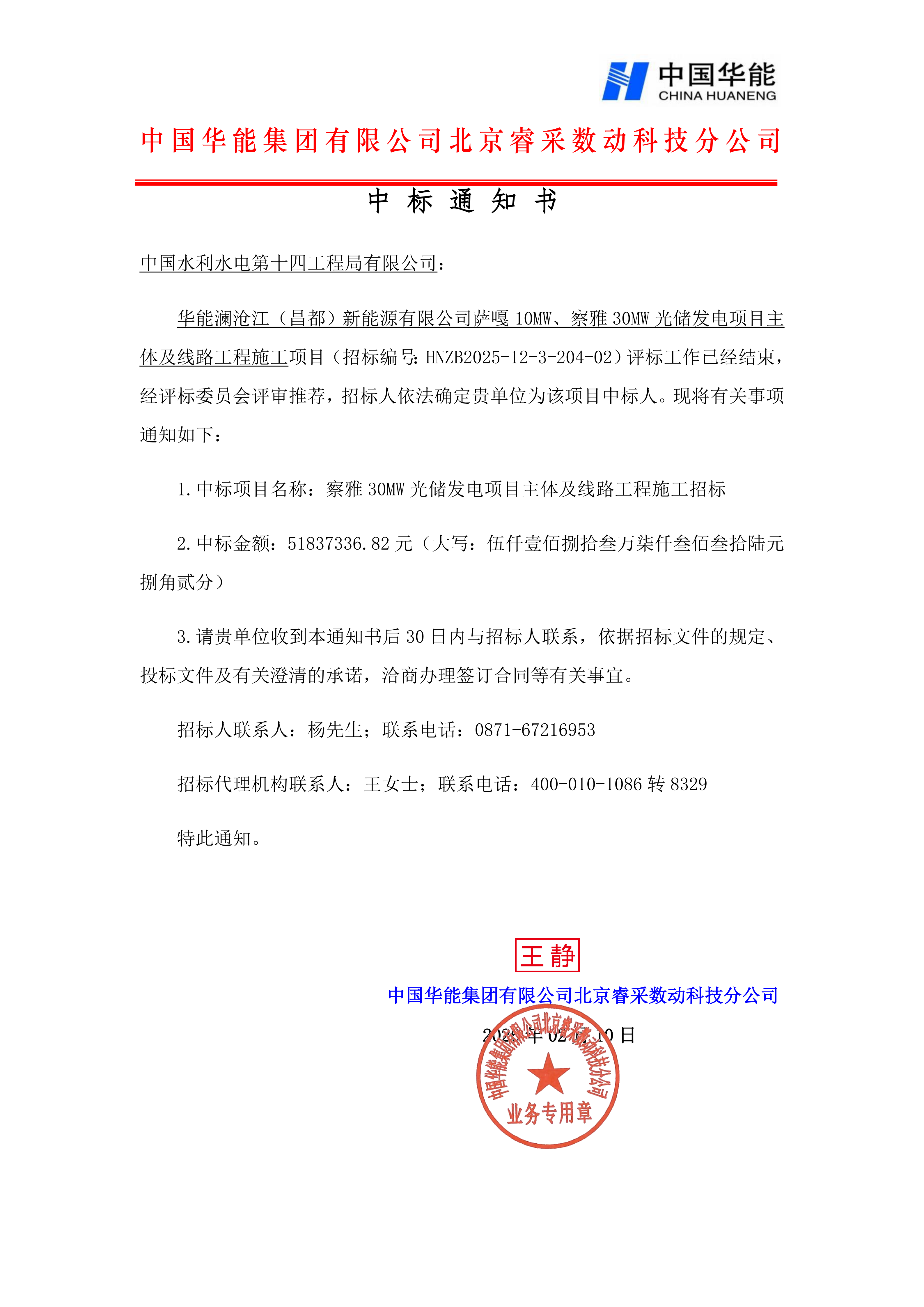 2026年2月10日,公司中标察雅30MW光储发电项目主体及线路工程施工项目,中标金额5183.73万元。