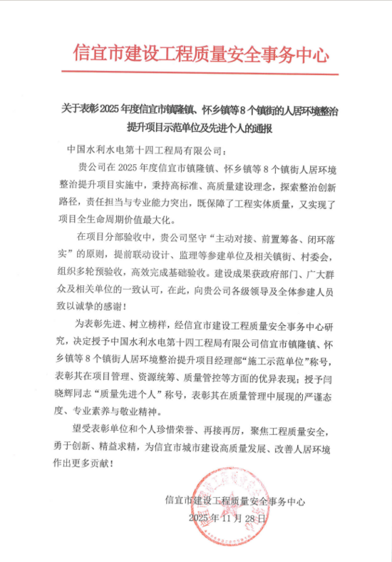 11月28日,信宜市建设工程质量安全事务中心发来表彰通报,茂名项目部在2025年度镇隆镇、怀乡镇等8镇街人居环境整治提升项目中,获评“施工示范单位”,员工闫晓辉荣获“质量先进个人”。正值四季度攻坚收官关键期,这份荣誉为项目部冲刺年度目标注入强劲动力。 项目推进中,项目部始终以高标准、高质量为准则,创新整治路径。验收阶段坚守“主动对接、前置筹备、闭环落实”原则,提前联动设计、监理及镇街、村委会开展多轮预验收,高效完成基础验收,建设成果获政府、群众一致认可。 项目部将以此次表彰为契机,在四季度最后冲刺阶段持续聚焦质量安全,发扬“施工示范单位”标杆作用,全力保障年度任务圆满完成,为信宜城市高质量发展与人居环境改善贡献更多力量。 | ||||