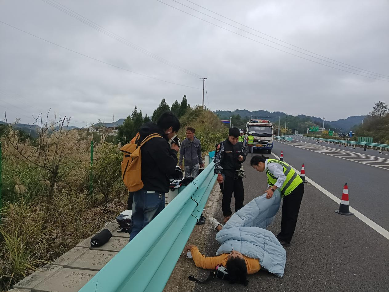 10月19日,凯环北高速毛家庄服务区上行出口处发生一起两轮摩托车追尾事故,服务区值班人员迅速展开救援,为伤员救治赢得宝贵时间。 事故发生在当天下午2:00,值班人员第一时间发现险情并携带应急救护工具赶往现场。只见两名驾驶员受伤躺在地上,摩托车零件四处散落,车身也有明显的撞击痕迹。 工作人员立即启动服务区应急联动机制,迅速在事故现场布好防护,防止二次事故的发生。同时上报监控中心、拨打120急救电话。在等待救护车期间,工作人员始终守护在伤员身旁,持续关注其身体状况,轻声安抚以缓解其紧张情绪,并将伤者转移到安全区域,为后续救治做好前期准备。 约20分钟后,120急救车顺利抵达现场。服务区工作人员协助医护人员将伤员平稳转移至救护车上,并简要说明现场情况及前期处置措施,为医护人员制定救治方案提供了参考。伤员由救护车转运至凯里市医院作进一步检查与治疗。 | ||||