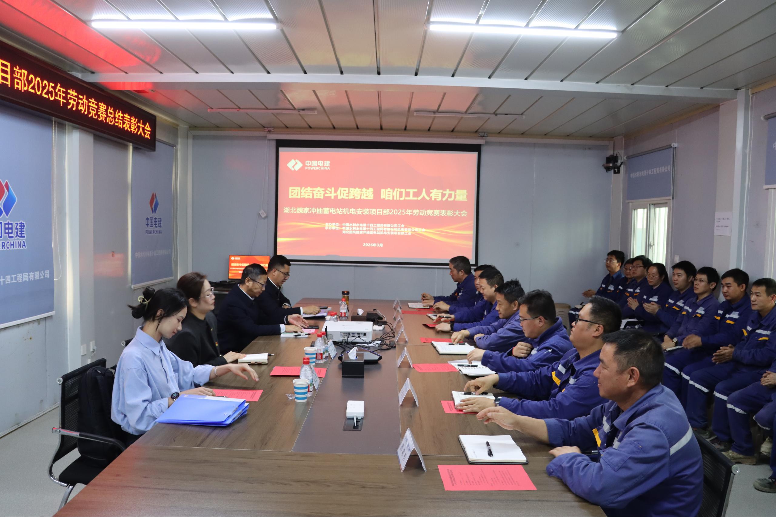 3月11日,由公司工会主办、机电安装公司工会和湖北魏家冲抽蓄电站机电安装项目部工会承办的2025年度“团结奋斗促跨越 咱们工人有力量”劳动竞赛总结表彰大会顺利举办。 会上,对2025年劳动竞赛进行总结汇报,系统回顾过去一年项目部围绕“团结奋斗促跨越 咱们工人有力量”主题攻克蜗壳水压试验、主变压器安装等一系列关键节点的奋斗历程。会上宣读了表彰决定,并对在竞赛中表现突出的2个先进集体和18个先进个人进行表彰。 会议指出,当前项目已进入全容量投产发电的攻坚冲刺期,任务艰巨、责任重大,全体参建人员要以先进为标杆,凝聚奋进力量;以实干为根基,筑牢安全、质量、环保发展底线;以创新为动力,依托技能大师工作室等平台,提升施工效能,深化技术攻关与人才培养。公司工会表示,工会作为职工的“娘家人”,将持续为大家办实事、解难题,搭建成长成才平台,让每一份奋斗都有回响。 此次表彰大会不仅是对过去一年劳动成果的集中展示,更是一次鼓舞士气、再启新程的思想动员。项目部全体人员表示,将以荣誉为动力,以目标为引领,继续保持昂扬斗志,全力以赴推进项目建设,奋力将魏家冲抽蓄电站打造成为全国中小型抽蓄项目标杆,为公司高质量发展和国家“双碳”目标实现贡献更大力量。 | |||||