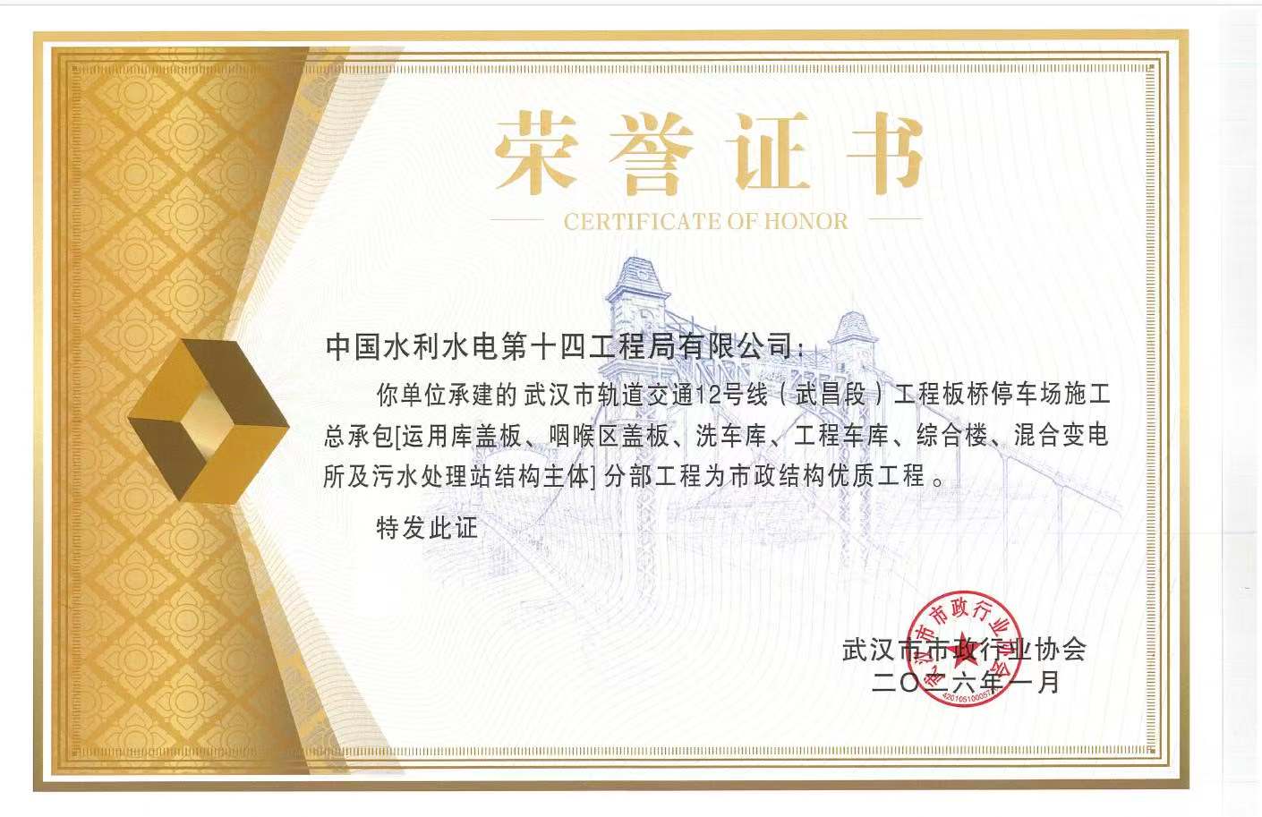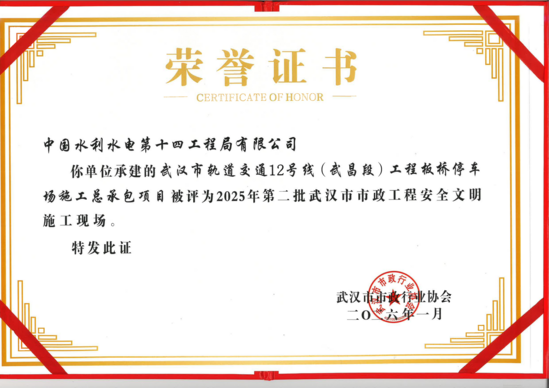 近日,由公司承建的武汉地铁12号线板桥停车场传来捷报:其运用库盖板、咽喉区盖板、洗车库、工程车库、综合楼、混合变电所及污水处理站等结构主体分部工程,被武汉市市政行业协会授予“市政结构优质工程”称号,项目施工现场同步荣获了“2025年武汉市政工程安全文明施工现场”荣誉,实现了安全、质量的双丰收。 作为武汉轨道交通线网中首条环线,武汉地铁12号线承载着串联三镇、便捷市民出行的重要使命,而板桥停车场作为该线路的关键配套工程,主要承担列车停放、检修保养、日常运维等核心职能,其施工安全与工程质量直接关系到线路未来的运营效率与可靠性。 项目施工面临体量大、结构复杂、多专业交叉作业等多重挑战。自开工建设以来,团队始终坚守“安全为先、质量为基”核心理念,构建全方位、多层次、高标准的安全质量管理体系,将精细化管理贯穿施工全流程各环节,在各方的积极努力下,最终实现安全、质量“双零”目标,牢牢守住安全质量底线。 此次两项荣誉的斩获,是武汉市市政行业协会对项目安全管理、工程质量的高度肯定,更是对项目团队实干担当、匠心筑造的有力激励。下一步,项目部将以荣誉为新起点,秉持“自强不息 创新进取 严谨实干 追求卓越”的企业精神,精益求精、笃行实干,严守安全底线、严把质量关口,全力推进项目后续建设,助力武汉地铁12号线早日通车,为武汉市民构建更便捷、安全的轨道交通出行网络。 | ||||