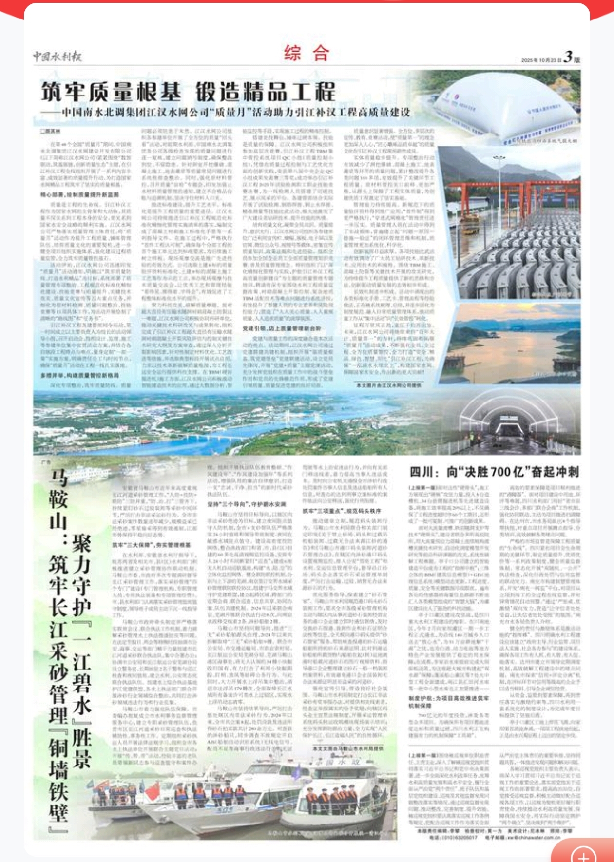 多措并举,构建质量管控新格局 深化专项整治,筑牢质量防线。质量问题必须防患于未然。水电十四局开展了全方位的质量“回头看”活动,对前期水利部、中国南水北调集团及公司各级检查发现的质量问题进行逐一复核,建立问题销号制度,确保整改到位、不留隐患。针对洞室开挖爆破、混凝土施工、地表灌浆等质量常见问题进行系统性排查整治。同时,强化原材料管控,召开质量“盲检”专题会,印发加强止水材料质量管理的通知,建立不合格品台账与追溯机制,坚决守住材料入口关。 推进标准建设,提升工艺水平。标准化是提升工程质量的重要途径。持续推进引江补汉工程规范化标准化精细化管理实施清单的落实,编制完成了混凝土衬砌施工标准化手册等一系列指导文件。在施工过程中,严格执行“首件工程认可制”,确保每个分部工程的首个施工单元达到标准要求,为后续施工树立样板。现场观摩交流是推广先进经验的有效方式。公司选取土建6标的质量验评资料标准化、土建8标的混凝土施工工艺等作为示范工点,举办现场观摩与技术质量交流会,让优秀工艺和管理经验“看得见、摸得着、学得会”,有效促进了工程整体标准化水平的提升。 聚力科技攻关,破解质量难题。面对超大直径有压输水隧洞衬砌混凝土防裂这一难题,积极协同科研单位,推动关键技术科研攻关与成果转化,组织完成了引江补汉工程超大直径有压输水隧洞衬砌混凝土开裂风险评估与控制关键技术研究大纲及方案审查,通过深入分析开裂影响因素,针对性制定材料优化、工艺改进等措施,并选取典型标段开展试点应用,力求以技术革新破解质量瓶颈,为工程长远安全运行提供科技支撑。在TBM(硬岩掘进机)施工方面,积极推动智能建造技术的应用,通过大数据分析、智能监控等手段,实现施工过程的精准控制。 搭建竞技舞台,锤炼过硬本领。技能是质量的保障。积极组织参加高层次竞赛,成功举办引江补汉工程2025年试验检测职工职业技能竞赛决赛,为一线检测人员搭建了切磋技艺、展示风采的平台。各建管部结合实际开展了试验检测、钢筋焊接、铜止水焊接、精准测量等技能比武活动,极大地激发了广大建设者钻研技术、提升技能的热情。 培育质量文化,凝聚全员共识。质量提升,意识先行。广泛利用宣传栏、横幅、展板、电子屏以及官网、微信公众号、视频号等载体,密集宣传质量知识、政策法规和先进经验。组织全员参加全国企业员工全面质量管理知识竞赛,普及质量管理理念。特别组织了以“深化精细化管理与实践,护航引江补汉工程高质量创新建设”为主题的质量管理专题培训,聘请资深专家围绕水利工程质量监督政策、衬砌混凝土开裂控制、复杂地质TBM适配技术等难点问题进行系统讲授,有效提升了参建人员的专业素养和风险预控能力,营造了“人人关心质量、人人重视质量、人人追求质量”的浓厚氛围。