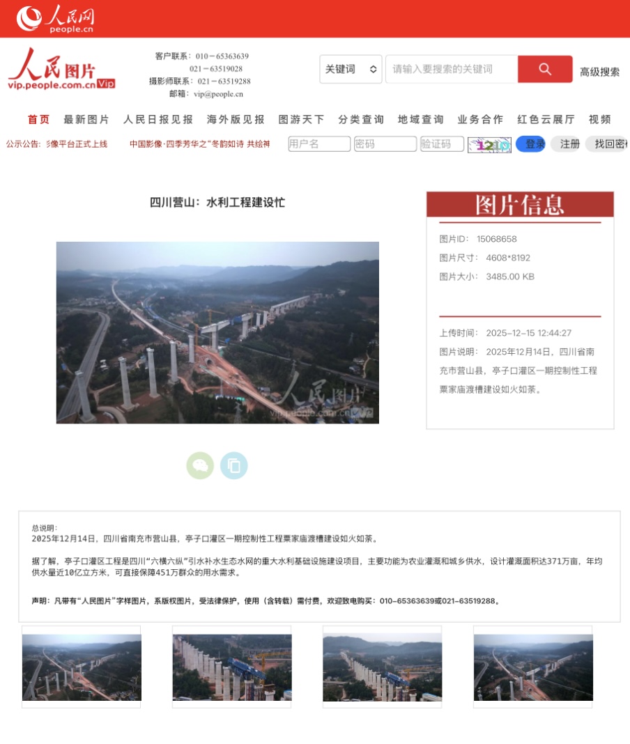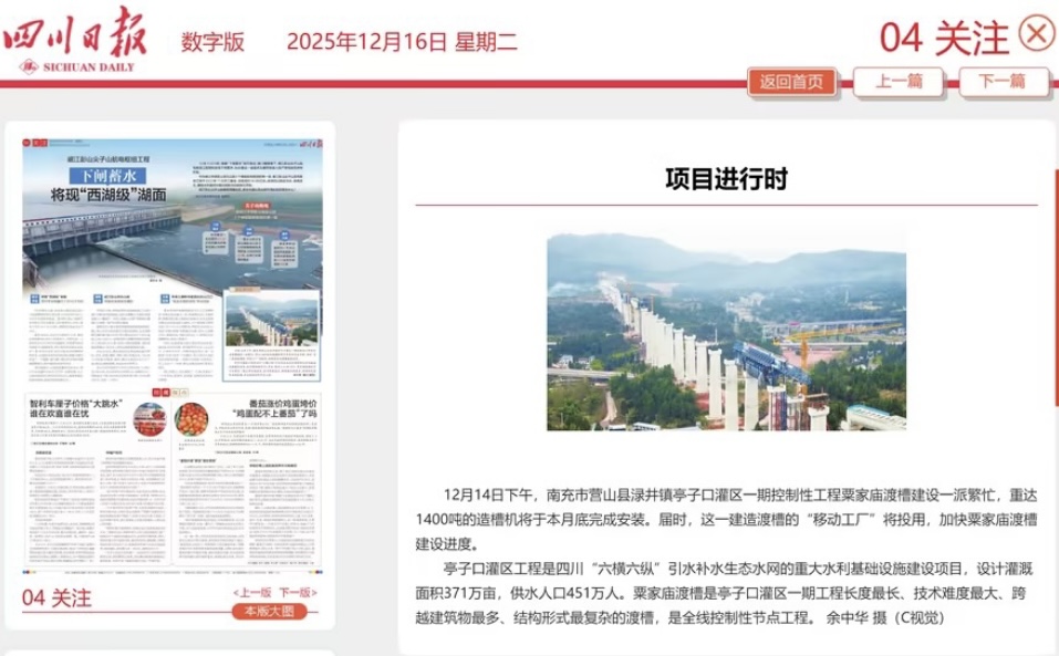 人民网(图片新闻):四川营山:水利工程建设忙 图片说明:2025年12月14日,四川省南充市营山县,亭子口灌区一期控制性工程粟家庙渡槽建设如火如荼。 链接:http://vip.people.com.cn/albumsDetail?aid=2019453 四川日报:项目进行时 12月14日下午,南充市营山县渌井镇亭子口灌区一期控制性工程粟家庙渡槽建设一派繁忙,重达1400吨的造槽机将于本月底完成安装。届时,这一建造渡槽的“移动工厂”将投用,加快粟家庙渡槽建设进度。 亭子口灌区工程是四川“六横六纵”引水补水生态水网的重大水利基础设施建设项目,设计灌面积371万亩,供水人口451万人。粟家庙渡槽是亭子口灌区一期工程长度最长、技术难度最大、跨越建筑物最多、结构形式最复杂的渡槽,是全线控制性节点工程。 | |||