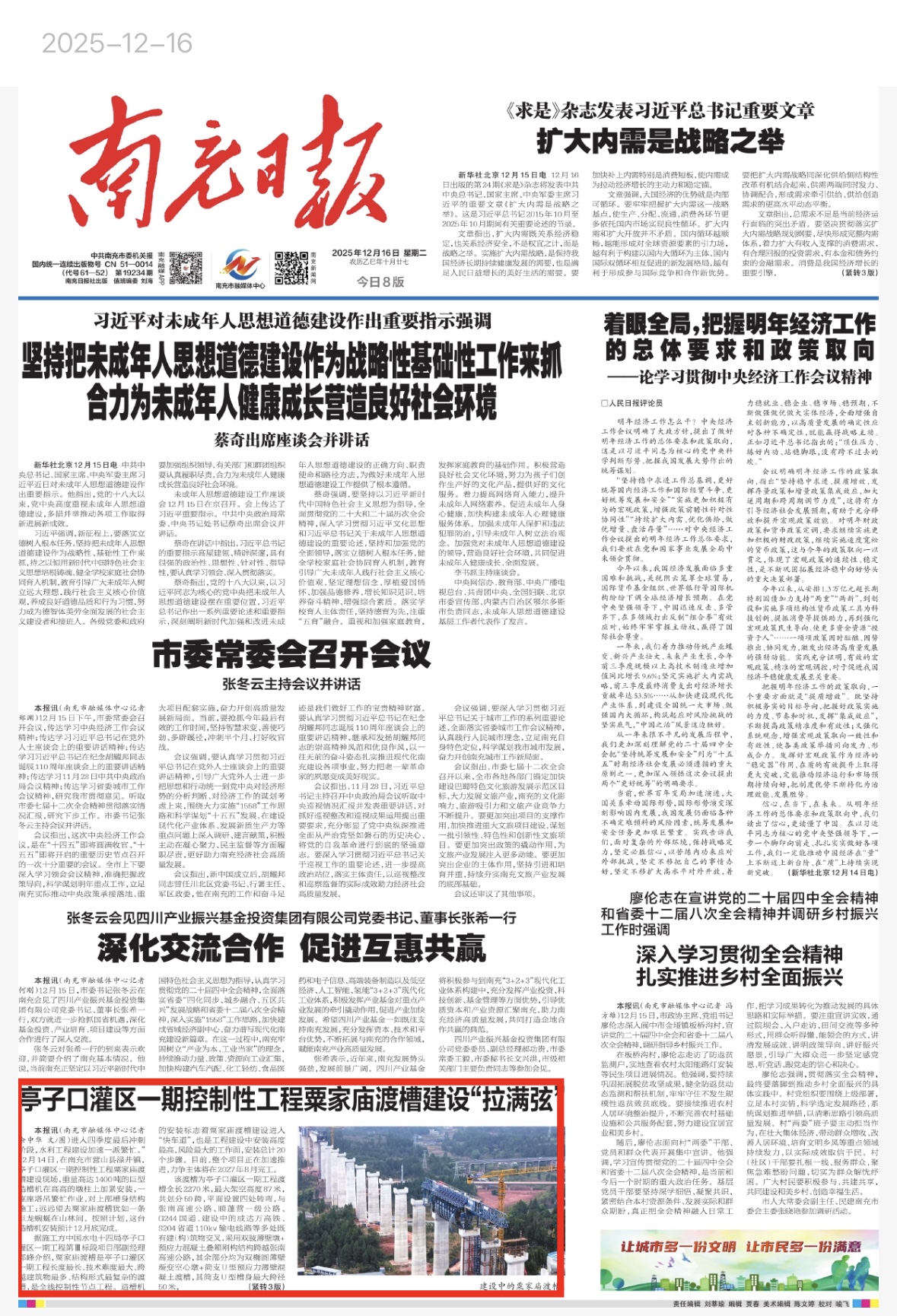 12月16日,《南充日报》版面对水电十四局承建的亭子口灌区一期工程进行了报道,内容如下: 建设中的粟家庙渡槽 南充市融媒体中心记者 余中华 文/图 进入四季度最后冲刺阶段,水利工程建设加速一派繁忙。”12月14日,在南充市营山县渌井镇,亭子口灌区一期控制性工程粟家庙渡槽建设现场,重量高达1400吨的巨型造槽机在高高的墩柱上加紧安装,一座座塔吊繁忙作业,对上部槽身结构施工;远远望去粟家庙渡槽犹如一条巨龙蜿蜒在山林间。按照计划,这台造槽机安装预计12月底完成。 据施工方中国水电十四局亭子口灌区一期工程第Ⅲ标段项目部副经理邓峰介绍,粟家庙渡槽是亭子口灌区一期工程长度最长、技术难度最大、跨越建筑物最多、结构形式最复杂的渡槽,是全线控制性节点工程。造槽机的安装标志着粟家庙渡槽建设进入“快车道”,也是工程建设中安装高度最高,风险最大的工作面,安装总计20个步骤。目前,整个项目正在加速推进,力争主体将在2027年8月完工。 该渡槽为亭子口灌区一期工程渡槽全长2270米,最大架空高度87米,共划分59跨,平面设置四处转弯,与张南高速公路、顺蓬营一级公路、G244国道、建设中的成达万高铁、S204省道110kv输电线路等多处既有建(构)筑物交叉,采用双肢薄壁墩+预应力混凝土叠箱刚构结构跨越张南高速公路,其余部分均为双椭圆薄壁渐变空心墩+简支U型预应力薄壁混凝土渡槽,其简支U型槽身最大跨径50米,为目前国内最大跨度预应力混凝土简支梁式渡槽,其预应力混凝土连续刚构渡槽上部U型内箱过水断面加大设计通过流量达52立方米/秒。 2025年作为工程建设推进的“决战决胜之年”,第Ⅲ标段全线所有工作面均已全面进入关键攻坚阶段,施工现场推进已形成全线开花、多点并进局面,全线建设进入“加速度”模式。截至目前,渡槽基础工程、支承结构已全部施工完成,现已全面转入槽身结构施工;粟家庙渡槽累计完成槽身施工1355米,整体进度已达60%。 亭子口灌区一期工程第Ⅲ标段主要跨越蓬安、营山两县,全长62.5千米,包含25条隧洞、1条施工支洞和3条检修支洞,隧洞总长43.9千米;占比约70%,渡槽7座,总长6.1千米,明暗渠总长12.5千米,截至目前,第Ⅲ标段主体工程工作面已全部打开,明暗渠工程已完成65%;隧洞工程已完成77%;渡槽工程已完成金甲坪、正沟和龚家坝三座渡槽,其中控制性工程桐子坝、粟家庙、唐家沟三座渡槽已完成占比65%。项目全体建设者正全力以赴,冲刺年终目标。 据悉,亭子口灌区工程涉及广元、南充、广安、达州4市13县(市、区),其中,南充境内项目地跨高坪区、阆中市、南部县、仪陇县、营山县、蓬安县,新建总干渠、东干渠、西干渠等灌溉渠系及1座提水泵站,设计灌溉面积74.7万亩。亭子口灌区工程是四川“六横六纵”引水补水生态水网的重大水利基础设施建设项目,主要功能为农业灌溉和城乡供水,设计灌溉面积371万亩,供水人口451万人。 网络连接:http://xncrb.cnncw.cn/mshow/id/53499/time/20251216/page/A1#page0 | |||