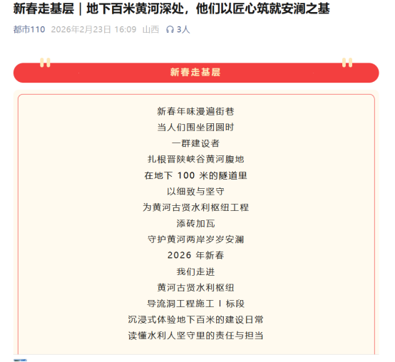 新春年味漫遍街巷当人们围坐团圆时一群建设者扎根晋陕峡谷黄河腹地在地下 100 米的隧道里以细致与坚守为黄河古贤水利枢纽工程添砖加瓦守护黄河两岸岁岁安澜。 百米隧洞,藏着工程硬底气 我们换上安全装备,在从业 22 年的生产副经理谭开宏带领下,穿过 325 米施工支洞,抵达埋深 100 多米的导流洞。这里开挖高度达 19 米,衬砌后仍有 16 米,3 米厚的混凝土层筑牢屏障。“这洞为黄河改道所用,5000 立方米每秒的过水量,20 年一遇的大水都能轻松扛住。” 谭开宏的底气,源于设计师 30 年的测绘勘探,更源于建设者对质量的极致追求。 人工清底,毫厘之间见匠心 我们与工人一同体验人工清底,这看似简单的工作,却容不得半点马虎。虚渣、浮土、细尘需彻底清理,湿布擦、干布抹、吸尘器吸,犄角旮旯也绝不放过。蹲站交替的作业姿势,半小时仅清理小片区域,让我们真切体会到这份工作的不易。“基岩面不清净,混凝土结合不密实,工程质量就过不了关。” 一名熟练工人一天最多仅能清理 16 平方米,两条 3000 多米的导流洞,全靠这样一厘米一厘米推进,水清如纯净水、手摸无粉尘,便是他们坚守的验收标准。 廿二载耕耘,水利人的热爱与牵挂 44 岁的谭开宏,从毕业便投身水利行业,22 年从青涩小伙到中年匠人,参与 7 项重大工程,古贤水利枢纽是他最引以为傲的一个。“能参与黄河干流的骨干枢纽工程,是荣幸更是责任。” 常年扎根工地的他,一年最多回家 20 天,妻儿寒暑假的工地探亲,是他最温暖的慰藉。午休时一通视频,一句 “想吃你做的臊子面”,道尽对家人的思念,这也是无数水利建设者的日常,他们以小家的缺席,换工程的稳步推进。 春节不打烊,盼大坝福泽两岸 春节期间,工程不停工、建设不打烊。站在大坝坝轴线,晋陕两岸隔河相望,壮阔黄河奔涌向前,谭开宏的期盼质朴而坚定:盼大坝早日建成,造福黄河两岸百姓。作为黄河流域生态保护和高质量发展的标志性项目,古贤水利枢纽建成后将承担防洪减淤、水资源调蓄、供水灌溉等重要功能,为黄河水沙调控筑牢根基。 报道链接:https://mp.weixin.qq.com/s/6OT9tqK4d7C_CmcWBtvPag | |||