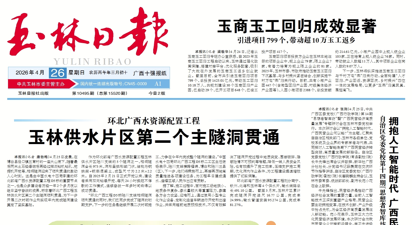 4月25日,由中国水电十四局承建的环北部湾广西水资源配置工程施工D5标相垌隧洞顺利贯通,这也是环北广西工程玉林供水片区陆川支线首条贯通的隧洞。 4月25日凌晨,随着掘进设备的钢臂带着震颤有力开挖,最后一方岩土轰然落下。隧道灯光刺破尘雾,两壁之间的最后一道屏障应声破开,相垌隧洞实现贯通。 相垌隧洞位于博白县径口镇,全长973米,采用钻爆法施工,断面形式为城门洞形,净宽×净高为2.2米×2.2米。自2025年2月正式进洞施工以来,项目团队克服运输道路狭窄、大型设备进场难及地质条件复杂等多重挑战,通过提前谋划、加强材料管理、定制专业施工设备等措施,有效提升施工效率。施工中,团队严格遵循施工标准,强化安全质量监督,通过建立隐患排查台账、专人值守及过程影像收集等方式,有效保障了施工安全可控。 中国水电十四局环北广西工程D5标二工区主任 谢杨:确保安全的情况下,我们每天的循环就是在0.3米左右。D5标陆川支线相垌隧洞正式贯通。接下来,中国水电十四局全体建设者将乘势而上,再接再厉,高质量的推进建设任务。 据了解,环北广西工程是国家水网骨干工程和西部陆海新通道保障性工程,是广西水网的主骨架与大动脉,是国务院部署实施的150项重大水利工程之一。工程以郁江为核心水源,连通12条河流和15座水库,输水线路总长491.10公里,项目建成后供水范围覆盖南宁、玉林、北海、钦州4个市、8个县(市、区)、9个工业园区、31个乡镇,直接惠及近1400万人口。该工程是广西目前总投资最大、受益人口最多、输水线路最长的跨流域、跨行政区域水资源配置项目,工程建成后将显著提升环北部湾城市群供水安全保障能力。 截至2026年3月31日,环北广西工程玉林供水片区累计完成隧洞开挖进尺16.77公里,完成率24.99%;输水管道安装95.274公里,完成率81.27%。 此外,玉林发布、玉林视听、玉林日报等多家地方媒体平台对环北部湾广西水资源配置工程施工D5标相垌隧洞顺利贯通进行了报道。 报道链接: 玉林广播电视台:https://mp.weixin.qq.com/s/NzpLO8bjRUfuZf9tvxTy6A 玉林发布:https://mp.weixin.qq.com/s/leD_Mlyq94WQQpgK81fdmw 玉林日报: