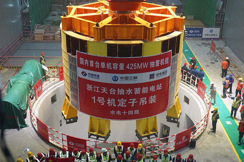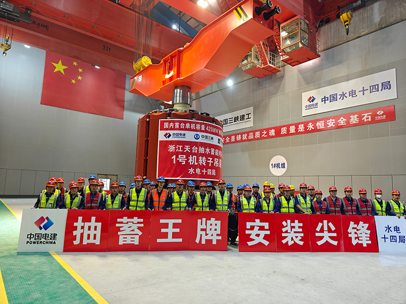 天台抽水蓄能电站首台机转子吊装顺利就位。 “天台效率”的实践者 速度与精度并重,是天台抽水蓄能电站机电安装项目最鲜明的标签。自2024年7月机电安装及厂房装修工程正式开工,到2025年12月底首台机组投产,二十余个重大节点无一延期。 张自敏介绍,从场地平整开始,天台项目仅用51天就建成投用可容纳520余人同时办公和住宿的营地;面对超高水头和超大单机容量的技术挑战,首台(1号)机组从定子吊装至机组启动仅用7个月。 被称为机组“大动脉血管”的定子绕组环节,是确保发电机定子性能指标的核心与关键。项目团队在总结1—3号定子组装经验的基础上,通过优化施工工艺、精心组织,仅耗时43天就完成4号机定子绕组组装及耐压试验,施工质量、进度达行业领先水平。 定子下线过程中,为有效规避铜环焊接、打磨作业对定子下线质量产生的不良影响,技术人员对现场施工工艺进行优化。与传统工艺相比,优化后的工艺在铜环引线安装焊接方面成效显著,工作效率提高了50%。 经项目团队全力攻坚,首台机定子在地下厂房安装间完成组装、叠片、线棒下线、耐压试验等数十道安装工序,所有装配检测和试验验证数据优良,一次性通过所有检测,提前37天完成施工任务。 于今年1月9日投产的2号机组,项目调试团队在倒送电完成后,日夜鏖战,仅用26天便完成2号机组全部调试与考核试运行,创下行业新速度。每一道工序精益求精,每一个节点高效完成…… “硬核履约力”的背后,是一支年轻而坚韧的铁军。天台抽蓄项目部班子中,40岁以下青年占三分之二;中层干部年轻化占比达五分之四。他们既是“地下铁军、水电劲旅、抽蓄王牌”的传承者,更是“安装尖锋”的锻造者。 由天台项目部党支部书记、全国技能大师杨庆文领衔的“大师工作室”,是技术攻坚的“最强大脑”。党支部将“堡垒”筑在工地上,设立3个党员责任区,成立党员先锋队和青年突击队。在首台机组调试的攻坚时刻,从技术支撑到后勤保障,党员身影无处不在。 依托水电十四局机电安装领域3个国家级、10个省级技能大师工作室形成的集群优势,天台项目形成了“大师带能手、能手带技工”的人才梯队。 “将核心技术牢牢掌握在自己手中”,是这支队伍的信条。项目部坚持以自有职工队伍为核心,牢牢掌握机组核心安装工艺,关键工序作业负责人全部由自有职工担任。“安全、质量、进度”的管控要求一竿子插到底,实现了“核心人员自有、核心技术自控”。 “我们传承的,不仅是安装机组的技术,更是那份‘自力更生、艰苦创业’的初心,和‘知道做到、说到做到’的坚定承诺。”张自敏表示。从天台山再出发,这支“安装尖锋”团队,正将红色基因转化为攻坚克难的澎湃动能。