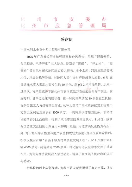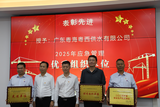12月19日,环北广东工程施工B4标项目部收到了化州市水务局颁发的“2025年度安全生产先进单位”荣誉牌匾及化州市安委办、应急管理局联合颁发的“感谢信”及“2025年度应急管理先进单位”荣誉牌匾。 自项目开工建设以来,环北B4标项目部始终坚持“安全第一、预防为主、综合治理”的方针,严格落实“治本攻坚三年专项行动”,以水利安全风险“六项机制”建设为契机,持续加大安全投入与标准化建设,全面加强风险管控与隐患排查双重机制,确保安全管理目标全面受控。在业主考核中,项目部多次荣获粤海集团“五星工地”称号,又在2024年荣获广东省水利工程文明工地、化州市水务局安全生产先进单位两项荣誉。 此次荣誉这既是对项目安全管理工作的高度肯定,更是对全体建设者坚守安全底线的有力褒奖。项目部将以此为新起点,持续夯实安全管理基础,创新安全管理举措,严格把控水利工程建设各环节安全关,以高标准、严要求推动项目安全管理工作再上新台阶,为环北部湾广东水资源配置工程的高质量推进筑牢安全屏障。