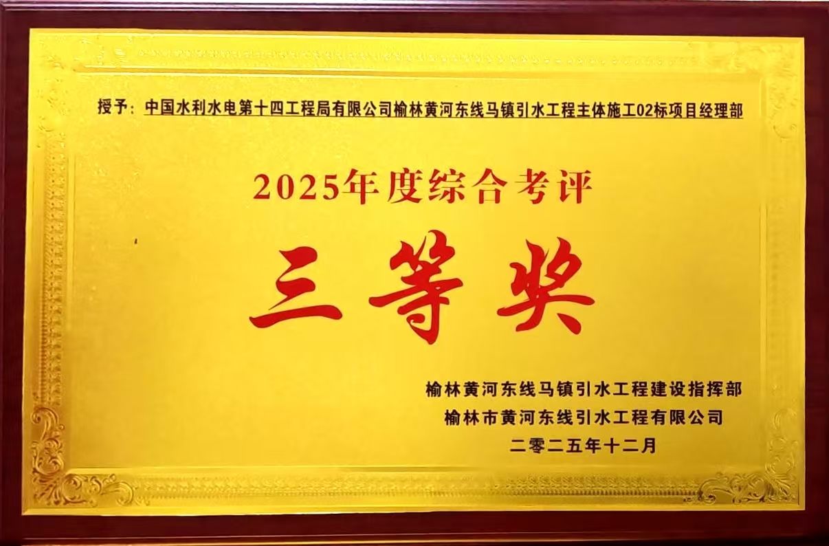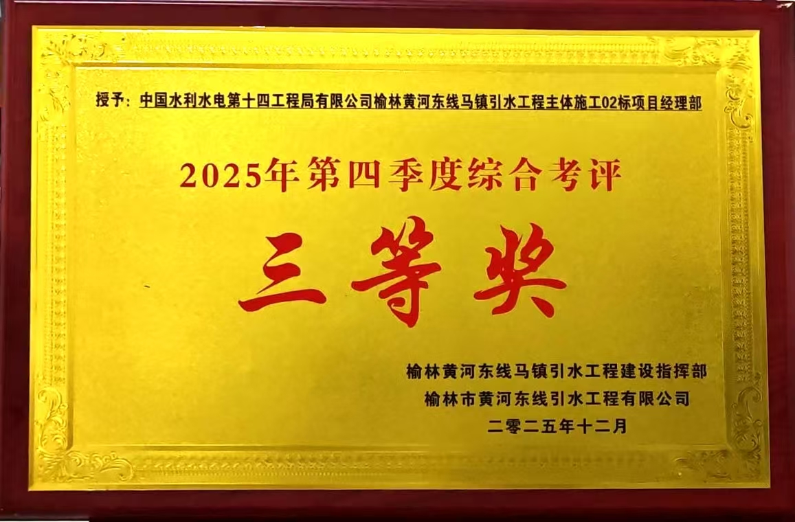 2026年1月5日,在业主单位召开的榆林黄河东线马镇引水工程2025年第三、四季度暨年度考评表彰大会上,榆林引水项目部喜获2025年度“质量月”活动先进单位、2025年度“消防应急救援演练”活动优秀组织单位、2025年度综合考评“三等奖”、2025年度第四季度综合考评三等奖、2025年度第三季度综合考评一等奖等多项荣誉。 每一项荣誉的背后都是项目部成员三百多个日夜的坚实足迹,从“质量月”的工艺严控到消防演练的迅捷响应,从技术攻关的聚力突破到季度考评的稳步提升,项目部始终发扬精益求精、追求卓越的工匠精神,将质量安全当作工程的“生命线”,用攻坚克难、永不言弃的实干担当完成了一个个节点,以众志成城、使命必达的坚定信念,突破了一道道难关。 这些荣誉既是对项目团队一年多来攻坚克难、精益管理的充分肯定,也是对技术攻关、质量保障的集中体现。2026年,榆林引水项目部全体成员将继续保持奋进姿态,把过往的奋斗积淀为前行的勇气,以更高标准、更实作风,全力保障工程安全优质高效推进。 | ||||
