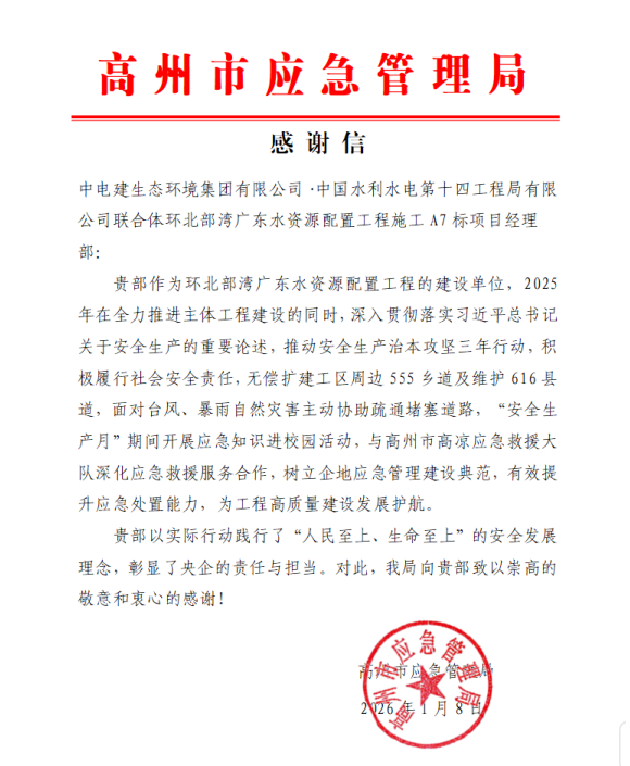1月8日,环北A7标项目部收到一封来自高州市应急管理局的感谢信,表扬其在工程建设中践行“人民至上、生命至上”理念,以央企担当筑牢安全生产防线。 2025年,在全面推进主体工程建设的同时,项目部积极推动“安全生产治本攻坚三年行动”,强化安全管理。无偿扩建555乡道及维护616县道,当时正值荔枝、龙眼等采摘季节,有效缓解了当地交通压力,显著提升了区域通行效率与应急响应能力。 面对台风、暴雨等极端天气,项目部主动作为,第一时间组织力量疏通当地村庄被阻断道路,保障应急救援通道畅通。在“安全生产月”期间,项目部积极开展“应急安全知识进校园”活动,并与高州市高凉应急救援大队建立常态化合作机制,通过联合演练提升协同处置能力。 环北部湾广东水资源配置工程是国家“十四五”重大水利工程,A7标段作为关键节点,项目部以实际行动诠释央企担当。下一步,项目部将会以更高标准、更实举措,继续前行在助力乡村振兴和生态建设的道路上。 | ||||