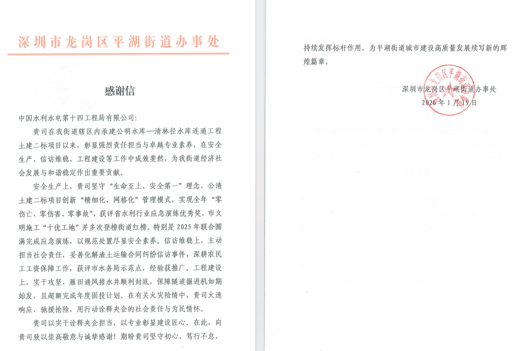 1月22日,2025年度平湖街道建设领域安全监管工作总结暨岁末年初安全监管工作部署会正式召开。公清项目部喜获深圳市龙岗区平湖街道党工委、办事处发来的感谢信,并被授予2025年度“奉献示范”单位荣誉称号。 2025年,公清项目部深度融入属地发展,始终坚守“生命至上、安全第一”的理念,在项目施工建设中创新推行“精细化、网格化、标准化”安全管理模式,实现全年“零伤亡、零伤害、零事故”,多次荣登街道安全文明施工“红榜”、荣获市级文明施工“十优工地”、省级水利建设工程文明工地、省级应急演练优秀奖等多项荣誉。在信访维稳与民生保障方面,项目部主动靠前,以“五首个”“六举措”管理体系成功化解矛盾纠纷,扎实做好农民工工资支付工作,获评市水务局示范点,经验获推广。工程建设上,攻坚克难,关键节点雁田通风排水井顺利封底,以安全优质施工保障隧道掘进机下线始发,超额完成年度投资计划。在年度各类应急演练和突发险情面前,项目部更是闻令而动,全力驰援,以实际行动彰显了央企的社会责任与为民情怀。 收获的荣誉,是激励,更是鞭策。公清项目部将再接再厉,继续发挥基层战斗堡垒和示范标杆作用,以更高标准、更实作风深耕一线,为公司高质量发展与平湖街道城市建设作出更多更亮眼的贡献。 | ||||