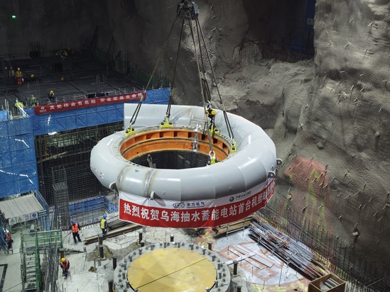 日前,内蒙古乌海抽水蓄能电站首台(1号)机组座环蜗壳精准吊装就位,标志着机电设备安装工程实现首个重大节点,向着电站首台机组投产发电迈出关键一步。 乌海抽水蓄能电站位于内蒙古自治区乌海市海勃湾区境内,共设计布置4台单机容量为300兆瓦的立轴单级混流可逆式水泵水轮机,总装机容量为1200兆瓦,额定发电水头411米。该项目是国家能源局“十四五”现代能源体系规划的重点工程,也是内蒙古电力集团自主建设的首个抽蓄电站,同时更是我公司与蒙电集团合作的首个蓄能项目,战略意义重大。 座环蜗壳是抽水蓄能电站中的关键埋入部件及机组过流核心设备,主要承担引导水流均匀、对称地进入转轮室,驱动水泵水轮机转动,实现水能与电能的高效转换的重要功能。同时,作为水泵水轮机的安装基准,该部件也是控制机组中心高程的重要结构。此次吊装的蜗壳分2瓣出厂,经现场组装焊接成整体,总吊装重量为106.4吨。 此次座环蜗壳的成功吊装,吹响了项目部“冲刺四季度,决胜全年度”的奋进号角,为2027年电站首台机组投产发电奠定基础,也进一步彰显了水电十四局在抽水蓄能领域“抽蓄王牌、安装尖锋”的品牌实力。 | |||||