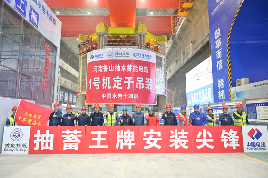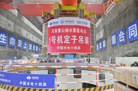 12月4日10时,水电十四局承建的鲁山抽水蓄能电站首台(1号)机组定子顺利吊装,标志着该电站正式进入核心设备安装阶段,为2026年电站首台机组投产发电筑牢关键基础。 鲁山抽水蓄能电站坐落于我国中原腹地,是河南省能源结构优化调整的重点工程。电站规划安装4台单机容量325兆瓦的水轮发电机组,总装机容量达130万千瓦。水电十四局承建电站输水发电系统、通风兼安全洞及机电设备安装工程等内容。 作为水轮发电机的核心部件,首台(1号)机组定子内径4.9米,外径8.14米,铁芯高度3.1米,由近10万张0.5毫米厚的硅钢片叠装而成,总组装重量约370吨,使用2台280吨桥机并车抬吊,含吊具总起吊重量达到447吨。以打造精品机组为目标,“安装尖锋”团队严格质量控制,展现高超专业水平,1号机定子一次性完成整体耐压试验,定子吊装一次性精准就位,为机组长期、安全、稳定运行奠定了坚实基础。 项目投产后,年发电量达10.5亿度,每年可节省标煤40.5万吨,相当于减少二氧化碳排放量102.5万吨、二氧化硫排放量2.56万吨、氮氧化物1.28万吨,对稳定电网运行、改善生态环境、优化旅游资源、推动经济高质量发展、助力乡村振兴具有十分重要的意义。 吊装现场(一) 吊装现场(二) | |||||