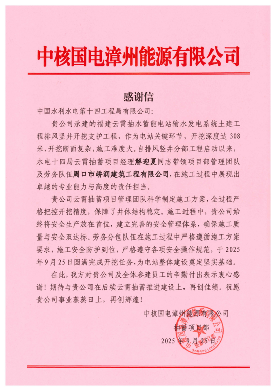 9月25日,福建云霄抽蓄项目排风竖井开挖支护任务圆满完成,项目收到业主中核国电漳州能源有限公司发来的感谢信,信中对排风竖井开挖支护过程中项目部全体员工的辛勤付出表示衷心感谢。 福建云霄抽水蓄能电站输水发电系统的土建工程中的排风竖井开挖支护工程是电站施工建设的关键环节,排风竖井开挖深度达308米,开挖断面复杂,施工难度大。为此,项目团队科学制定施工方案,精准完成反导井施工与设计断面扩挖,并针对不同围岩类型实施差异化支护,全过程严格把控开挖精度,确保井身开挖尺寸符合设计标准,保障了井体结构稳定。 自开工以来,项目部始终将安全生产放在首位,建立完善的安全管理体系,对提升系统、爆破作业等关键环节开展专项管控,确保施工质量与安全双达标。劳务分包队伍在施工过程中严格遵循施工方案要求,施工安全防护到位,严格遵守各项安全操作规范。 信中对项目部管理团队在施工过程中展现出卓越的专业能力与高度的责任担当表示高度认可和感谢。表示期待未来与公司继续深化合作,携手推进云霄抽水蓄能电站后续建设,共同为国家能源事业发展贡献力量。 | ||||