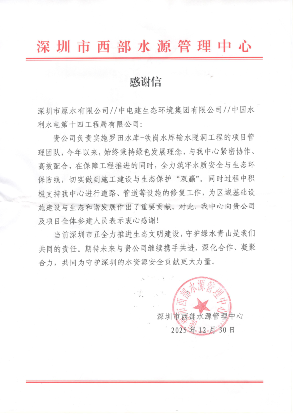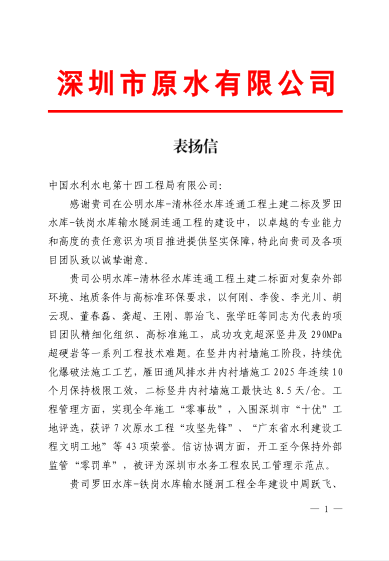 1月15日,罗铁项目部收到来自深圳市西部水源管理中心的感谢信和深圳市原水有限公司的表扬信。 其中,深圳市西部水源管理中心在信中充分肯定了项目部今年以来在罗田水库-铁岗水库输水隧洞工程建设中坚持绿色施工、保障水质安全、维护生态环保等方面取得的成效,高度评价了项目团队与中心紧密协作、高效联动的工作机制,并对项目部支持道路及管道设施修复工作表示感谢。 深圳市原水有限公司在表扬信中指出,罗铁项目部在施工过程中科学组织、精细管理,克服地质复杂、工期紧张等多重挑战,确保工程安全优质高效推进,尤其在关键节点上展现出卓越的执行力与专业水平,为区域原水供应保障和重大水利设施建设作出积极贡献,特此予以通报表扬。 表扬信和感谢信不仅是对项目团队辛勤付出的高度认可,更是对水电十四局履约能力与责任担当的充分信赖。两封来信凝聚着政府单位、业主单位对项目建设成果的满意与期许,也承载着社会对重大民生工程的关切与厚望。全体参建人员当以此为激励,再接再厉,持续发扬攻坚克难、精益求精的优良作风,奋力推进后续工程建设任务,确保项目安全、优质、如期交付,为粤港澳大湾区水资源配置体系建设贡献更大力量。 | ||||