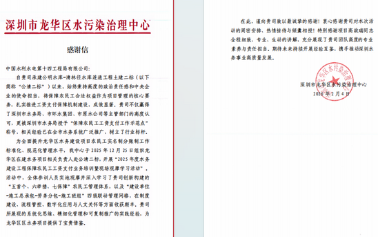 2月5日,公清项目部收到深圳市龙华区水污染治理中心发来的感谢信,信中高度肯定了项目部在保障农民工工资支付方面的创新实践与管理成效。 信中指出,项目部自开工以来,始终秉持高度的政治责任感和央企的使命担当,将“服务群众、促建促效”保障农民工权益作为核心任务,扎实构建工资支付保障机制,创立“五首个、六举措、七保障”管理体系及四级联动管理网格,为全市水务系统树立了标杆,并被市水务局授予“保障农民工工资支付工作示范点”。信中提到,此前龙华区水务局组织区内水务项目代表到项目现场开展观摩培训,项目部精心安排、无私分享,展现的系统化思维、精细化管理和可复制推广的实践经验,获得参训人员一致好评,为龙华区水务项目提供了宝贵借鉴。 此次获致感谢信,是对项目部农民工管理及标准化建设工作的又一次认可。项目部将继续保持优良作风,深化管理创新,积极履行社会责任,助力深圳水务建设高质量发展。 | ||||