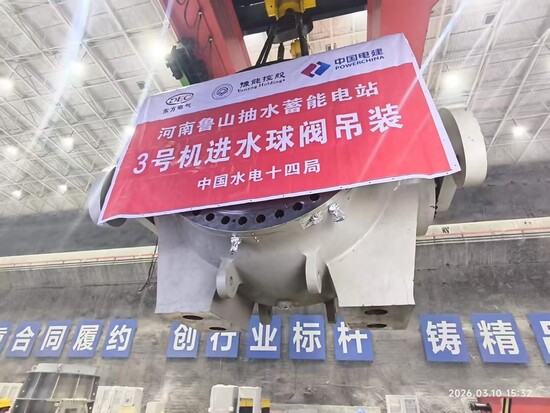 3月10日,鲁山抽蓄电站3号机组进水球阀吊装完成,顺利完成又一大件吊装任务。 本次吊装的进水球阀起吊总重约123吨,外形尺寸为3120×5090×4100毫米(长×宽×高),安装中心高程为266.0米,被誉为抽水蓄能机组“钢铁心脏瓣膜”的核心设备。吊装前,鲁山机电安装项目部严格落实球阀安装标准工艺,确保安装质量。同时加强吊装设备的安全检查,对桥机、吊具、吊装通道等进行联合检查,保证万无一失。吊装过程中,严格执行三起三落,限速吊装,整个吊装过程有条不紊,安全有序。经过两个小时的吊装,球阀顺利吊装就位。 鲁山抽蓄电站额定水头557米,总装机容量1300兆瓦,设计安装4台可逆式水泵水轮机组,建成后,每年预计可消纳数亿千瓦时清洁能源,节约标煤40余万吨,减排二氧化碳100余万吨,将成为中原地区重要的“绿色充电宝”。 | ||||