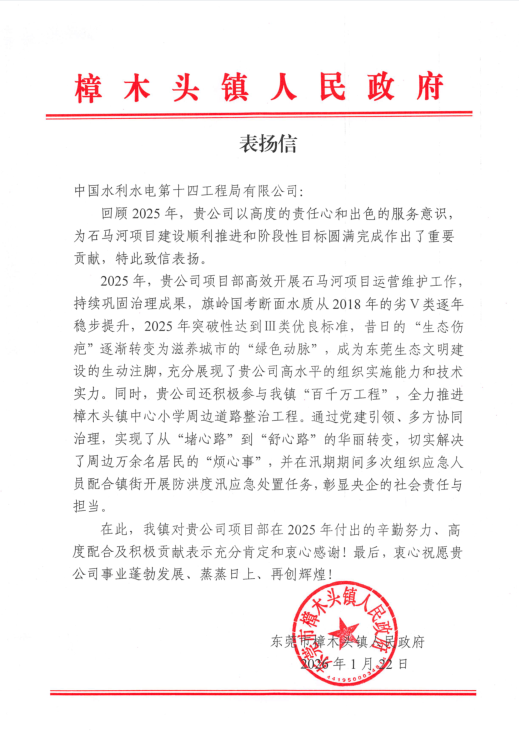 1月22日,东莞项目部收到樟木头镇人民政府发来的表扬信,这份荣誉是对项目部2025年深耕地方建设的极大肯定。 2025年,项目部通过精细化运营维护持续发力,推动断面水质实现多年连升,旗岭国考断面水质从 2018 年的劣 V类逐年稳步提升,2025 年突破性达到I类优良标准,昔日的“生态伤疤”逐渐转变为滋养城市的“绿色动脉”。积极参与樟木头镇“百千万工程”,全力推进樟木头镇中心小学周边道路整治工程。通过党建引领、多方协同治理,实现了从“堵心路”到“舒心路”的华丽转变,切实解决了周边万余名居民的“烦心事”,并在汛期期间多次组织应急人员配合镇街开展防洪度汛应急处置任务,彰显央企的社会责任与担当。 这既是樟木头镇政府对项目部团队攻坚锐气的肯定,也是对匠心底色的赞许,更是对履约担当的认可,项目部将以此次表扬为动力,持续精进工作,在南粤大地书写治水兴水的新篇章。 | ||||