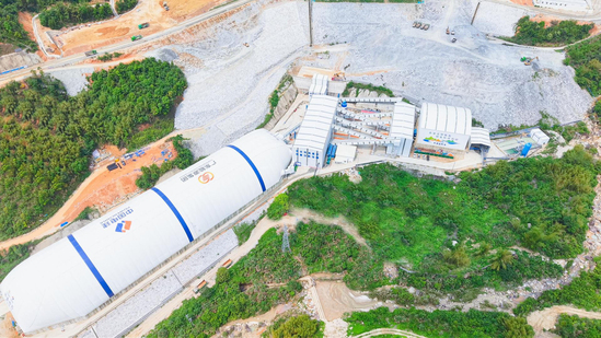4月28日,公司承建的陆河砂石加工系统项目顺利通过整体验收,标志着该系统进入全面投产运行阶段,将为广东陆河抽水蓄能电站建设提供有力的“粮食”供应保障。 广东陆河抽水蓄能电站是国家能源局重点实施项目,属一等大(1)型工程,电站主要由上水库、输水发电系统、下水库等三部分组成,建成后承担广东电网调峰、填谷、调频、调项、储能、事故备用、应急启动和多能互补等多项功能,加速推进区域“风光水火储”和“源网荷储”一体化建设。 公司承建的该系统主要承担下水库与输水发电工程混凝土和喷射混凝土所需264.09万吨砂石骨料的生产、计量和装车任务。系统采用“三段两闭路破碎+立轴破碎、对辊制砂机配合制砂+成品粗骨料水洗+干、湿砂混合+石粉回收”生产工艺,设计处理能力600吨/小时,设计生产能力480吨/小时,满足高标准工程建设需求,是电站工程建设的“绿色粮仓”。 经业主单位、监理单位、第三方质量检测单位等联合验收,一致认为设备处理能力、系统生产能力和成品骨料质量均符合国家与行业规程规范及设计要求,同时配套的除尘、污水处理设施运行正常,实现了生产过程清洁化、环保化,一致同意通过验收。 作为公司高标准化打造的砂石系统,该系统配备绿色智慧砂石加工系统,可根据工程不同时期不同型号的混凝土需求随时调整成品骨料生产比例,实时采集作业情况、设备效率、质量变化、生产能力等信息并动态优化;配备的成品料仓气膜,有效解决砂石骨料生产过程中扬尘、噪音等环保问题;采用“链条式刮砂机+高频脱泥筛+斜板式沉淀池+DH高效(旋流)污水净化器+板框压滤机”联合废水处理工艺,实现废水重复利用,做到“污水零排放”。此外,生产车间及胶带机整体封闭,兼顾抑尘、降噪、防雨功能。系统正式运行后,将打通区域砂石骨料供应链的关键环节,践行绿色发展理念,推动公司绿色砂石业务向标准化、智能化、生态化转型。 砂石系统航拍图 | ||||